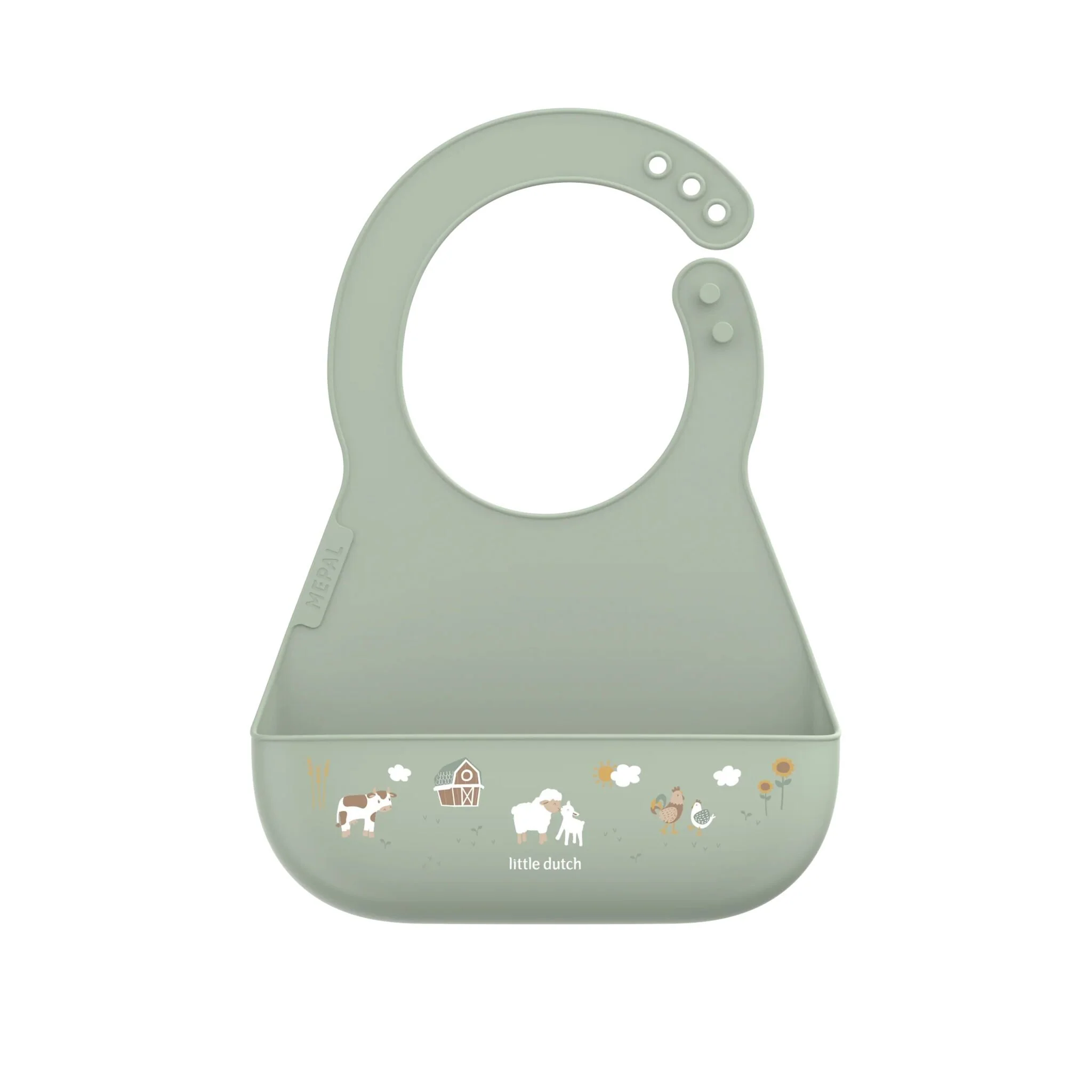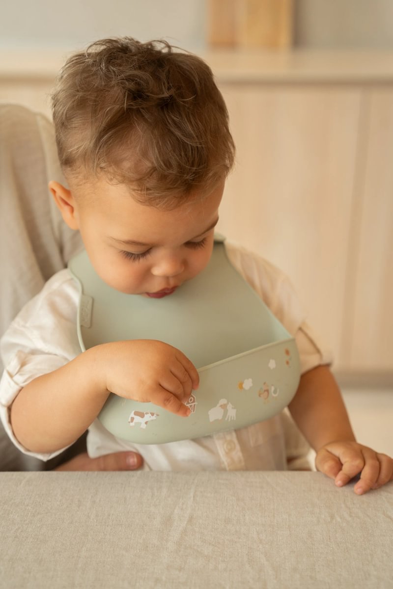 Torna as refeições mais práticas e divertidas com esta babete de silicone da coleção Little Farm.