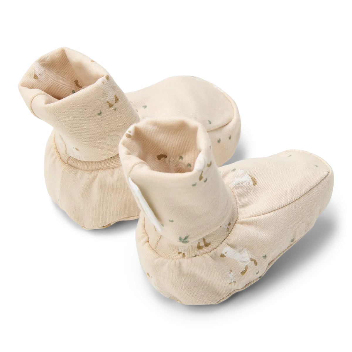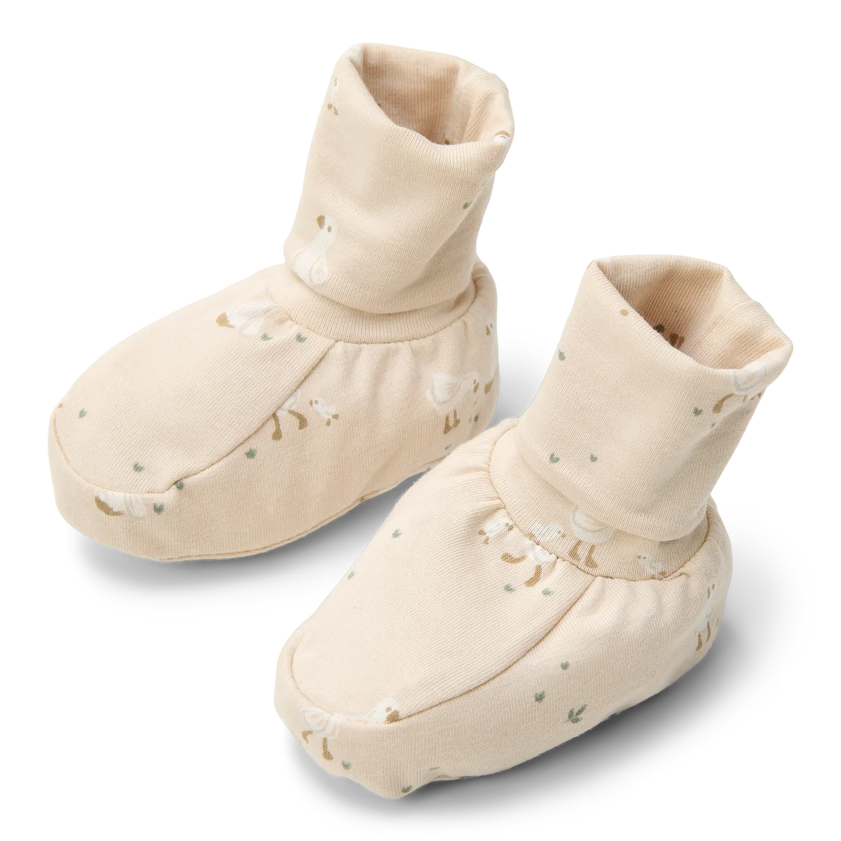 Para pezinhos sempre em movimento – mesmo que ainda seja só a dar pontapés no ar! Estas botinhas suaves e quentinhas com o estampado do Little Goose mantêm os dedos do teu bebé confortáveis. Feitas em algodão orgânico, disponíveis em tamanhos 44/56 e 62/74.