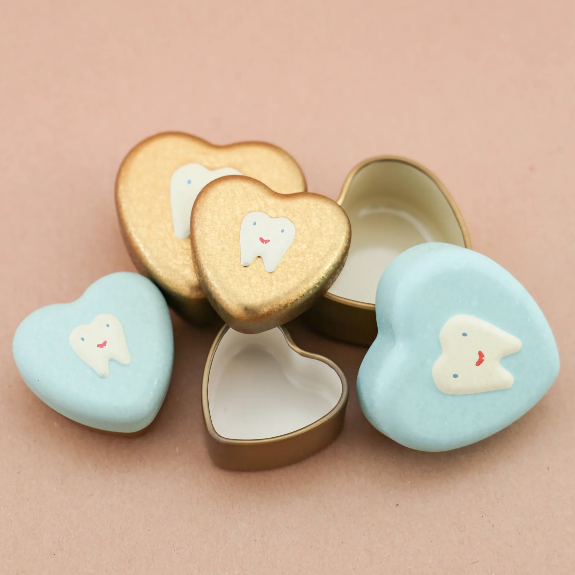 - Design delicado: Esta caixinha em forma de coração possui uma superfície na cor menta com um efeito craquelado e uma gravação de um dente na tampa, conferindo-lhe um toque especial e único.
