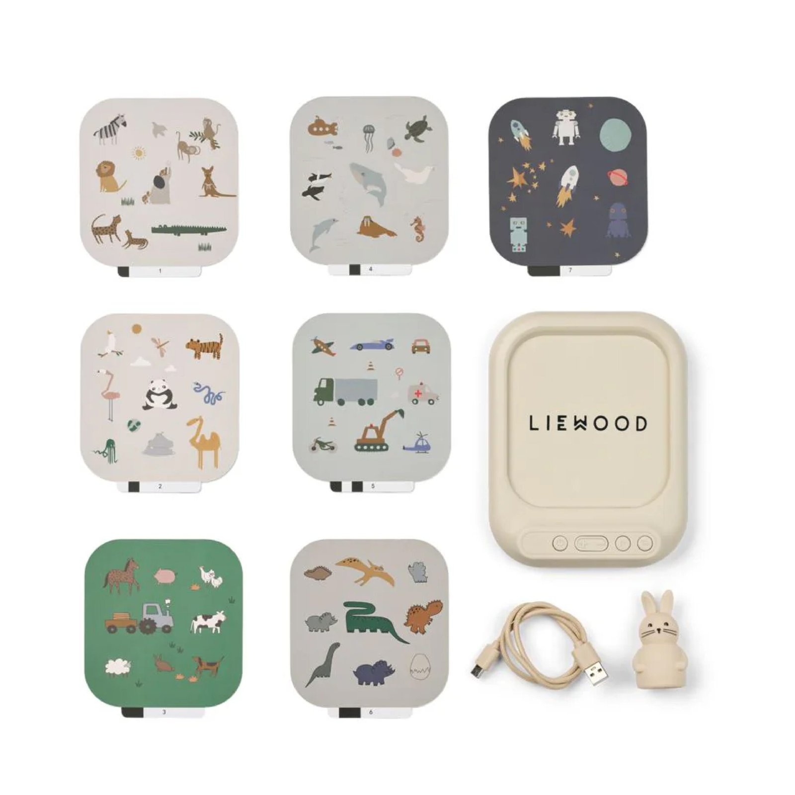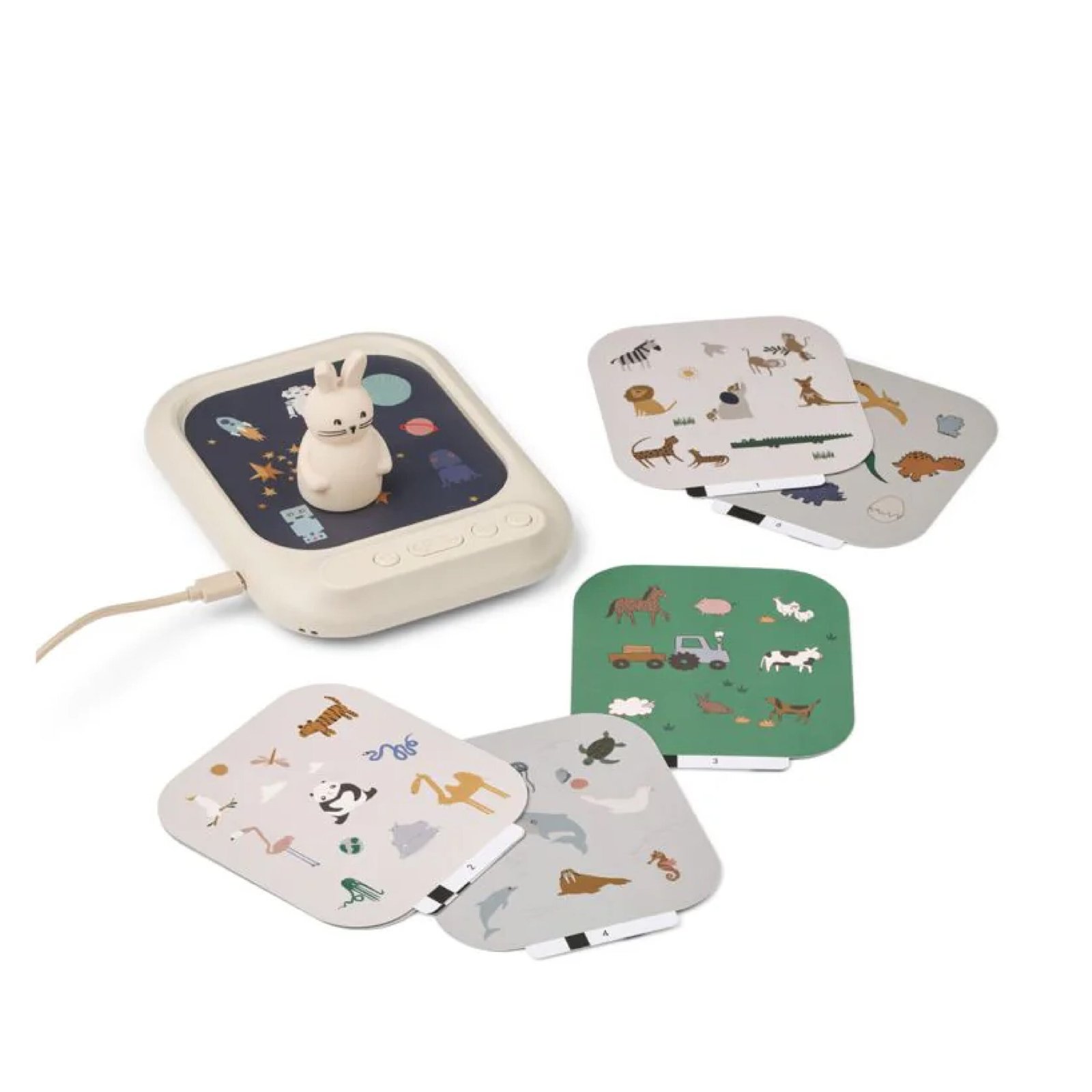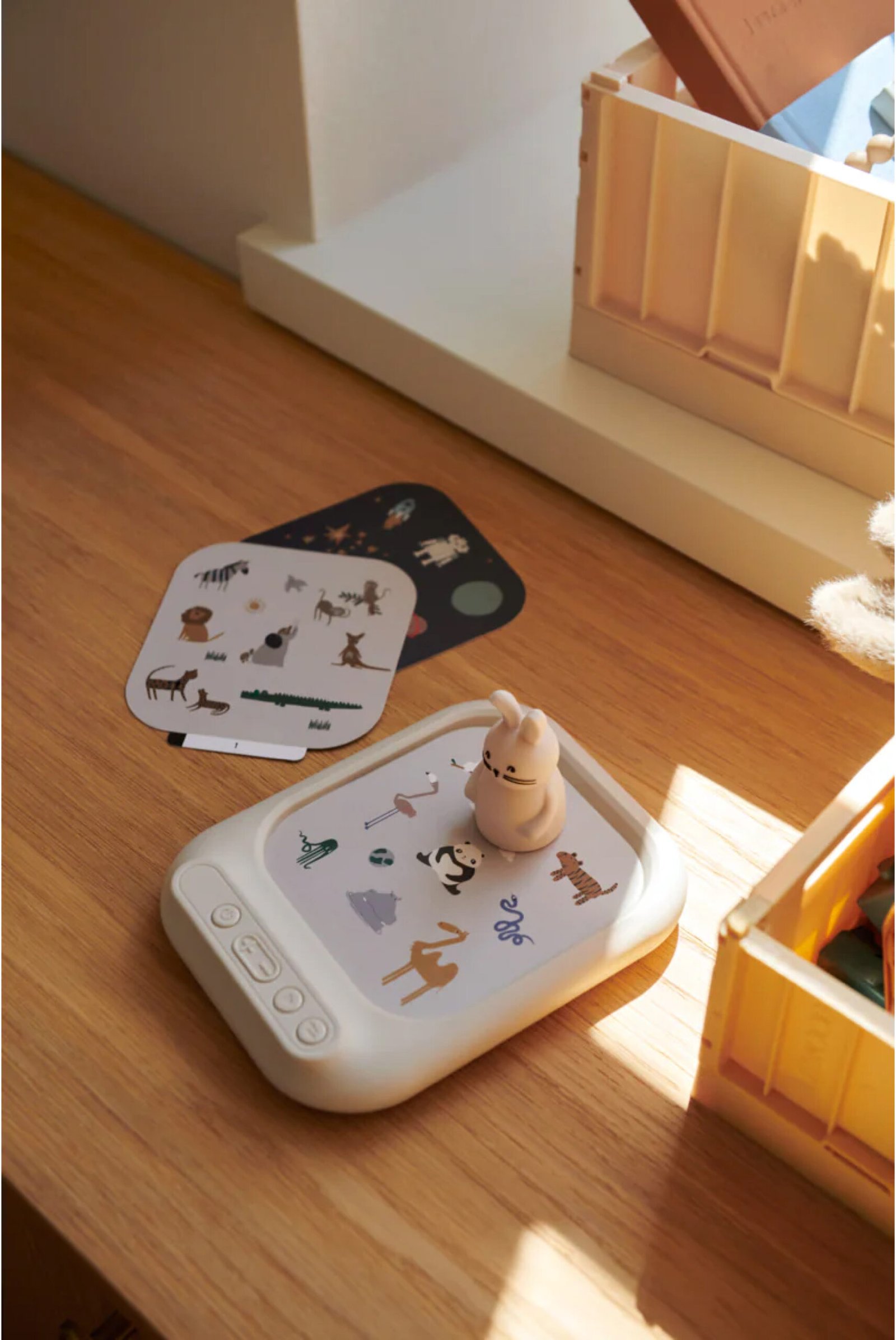 Com esta caixa de sons os pequeninos vão explorar diferentes mundos através dos sons. Tem 7 folhas temáticas como os animais da quinta, animais da floresta, o espaço, veículos, entre outros… e tem um coelho de borracha que vai activar os sons. É só inserir um folha de cada vez na caixa, colocar o coelho em cima de cada elemento e deixar as crianças identificarem o som. Tem ainda algumas músicas e sons como white noise para deixar os bebés relaxados.