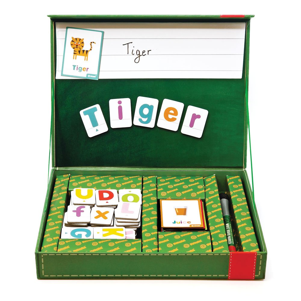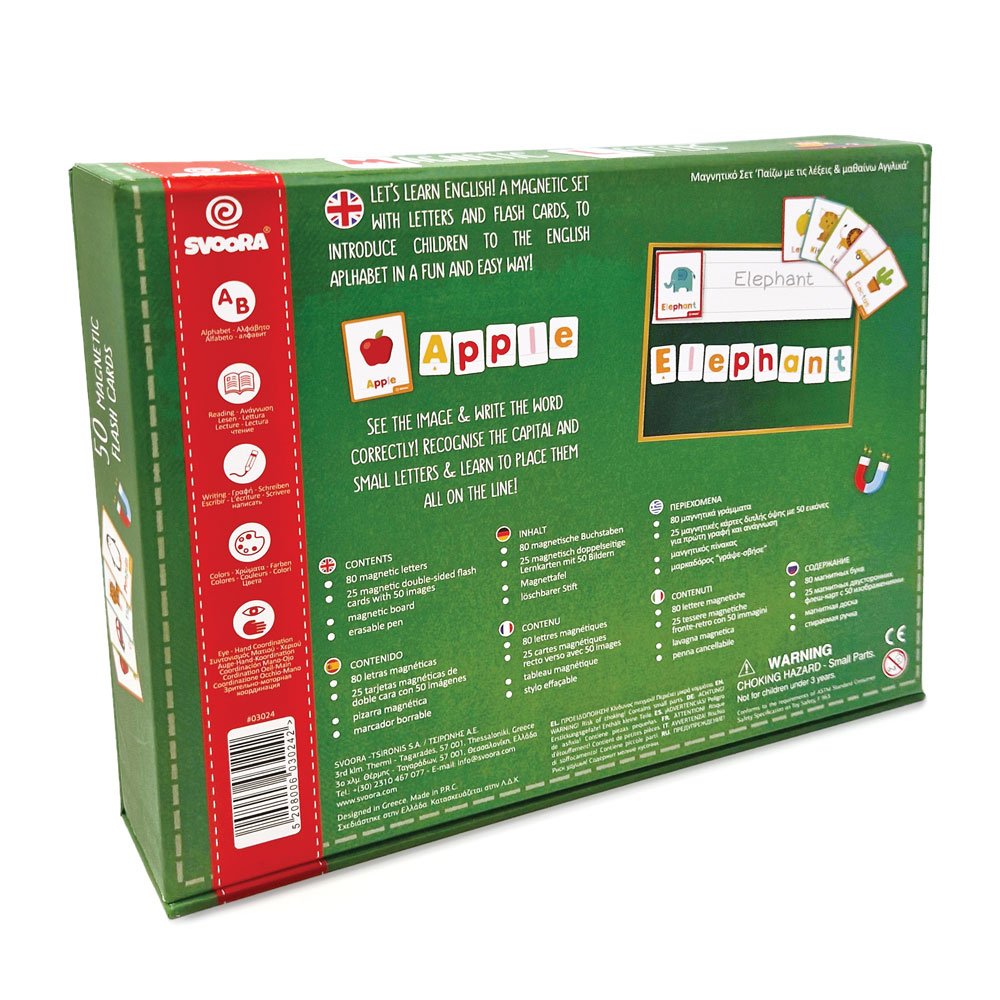 Explora o mundo das palavras e do alfabeto inglês com este conjunto magnético! Reconhece as letras minúsculas e maiúsculas e descobre uma infinidade de novos significados com os 25 cartões magnéticos dupla face incluídos. Estes cartões ajudam as crianças a associar ilustrações com palavras, ao mesmo tempo que se familiarizam com o processo de soletração e leitura. As peças magnéticas indicam as letras escritas numa linha, incentivando as crianças a praticar a escrita correta. Embalado de forma atrativa, oferece uma abordagem criativa para a observação e coordenação olho-mão. O conjunto inclui 25 cartões magnéticos dupla face, 80 letras magnéticas de alta qualidade, um quadro magnético e uma caneta apagável.