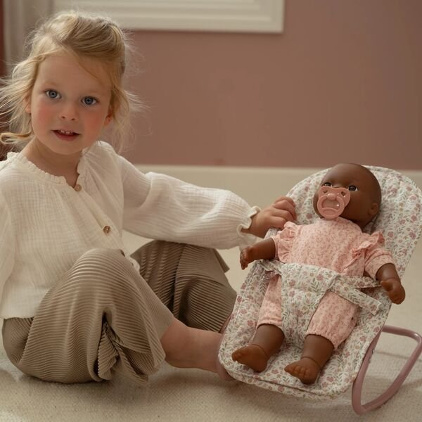Feita com materiais de alta qualidade, esta espreguiçadeira é suave ao toque e segura para os mais pequenos. As suas dimensões adequadas permitem que as bonecas tenham o descanso que merecem, enquanto as cores delicadas e elegantes trazem um toque de charme a qualquer espaço. Ideal para crianças entre os 2 e os 6 anos, é um convite à criatividade e ao cuidado, onde cada criança pode recriar cenários de ternura e amor.