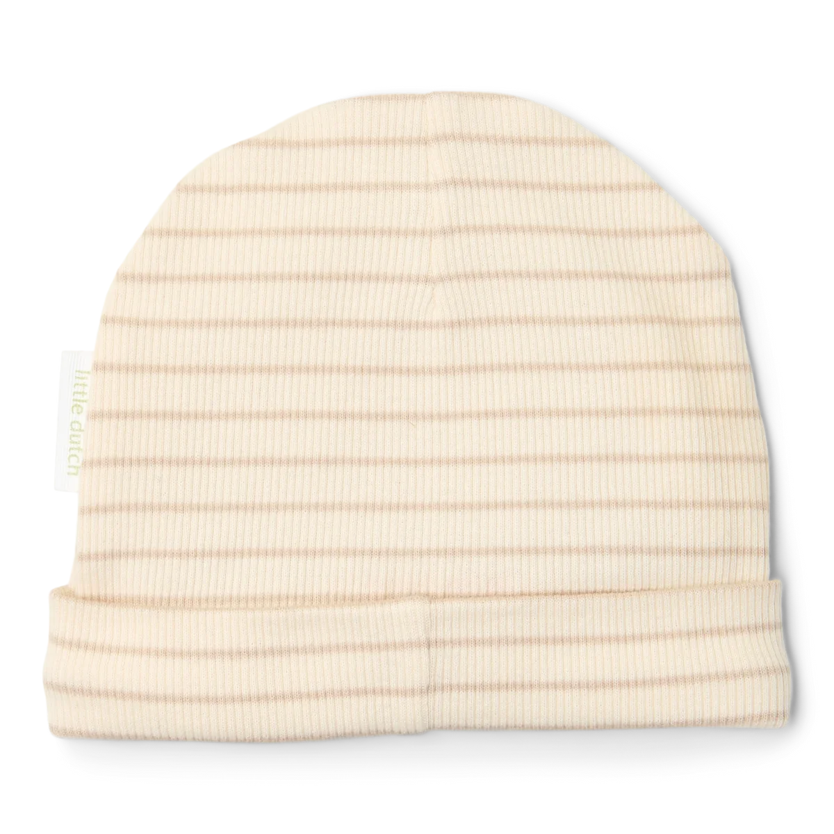 Riscas nunca saem de moda! Este gorro em malha canelada com riscas em bege e taupe é feito em algodão orgânico, super confortável e ajusta-se perfeitamente. Ideal para combinar com o restante da coleção Newborn.