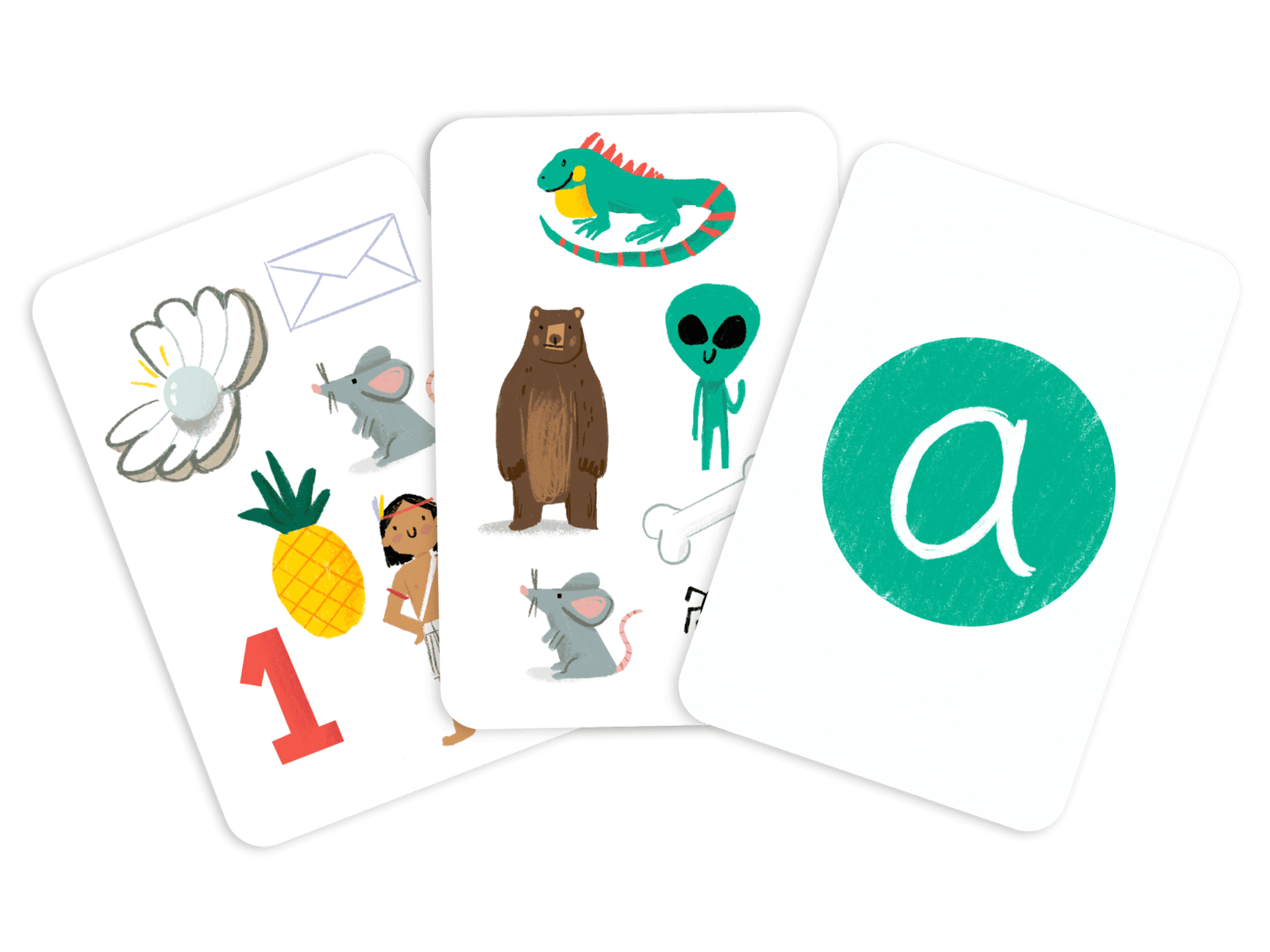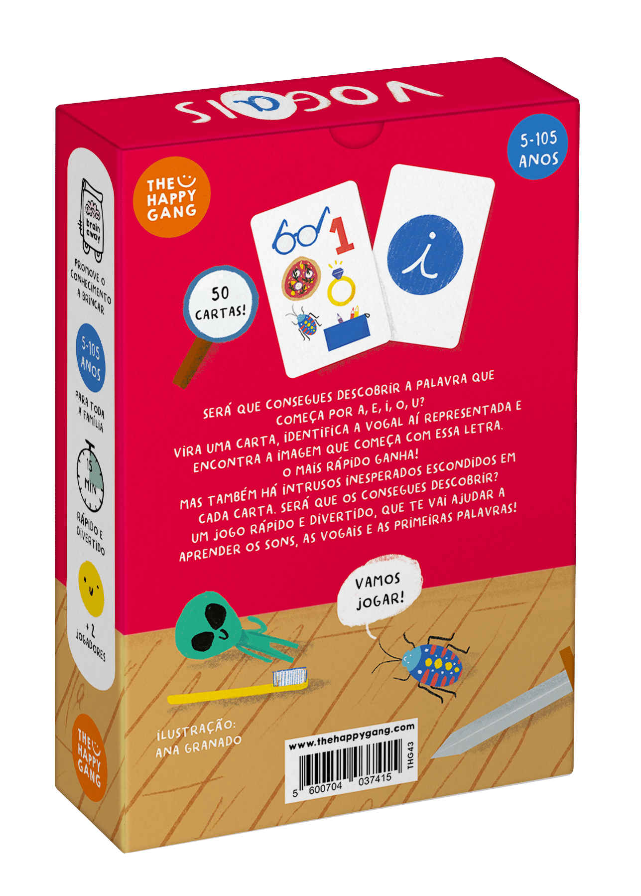 Será que consegues encontrar a palavra que começa com a, e, i, o, u? Vira uma carta, identifica a vogal aí representada e encontra a imagem que começa com essa letra, o mais rápido ganha! Mas também há intrusos inesperados escondidos em cada carta, será que consegues descobrir?