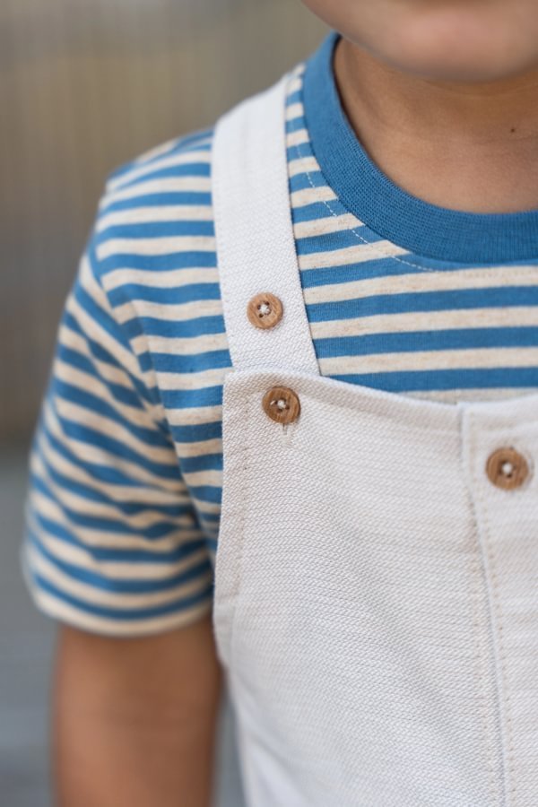 Feito em 100% algodão orgânico, este macacão é gentil com a pele delicada dos bebés, garantindo que eles se sintam bem durante todo o dia. O tecido respirável e macio é ideal para as aventuras de verão, enquanto os calções práticos permitem liberdade de movimento. Com um corte moderno e uma palete de cores que evoca a tranquilidade da natureza, este macacão é uma peça que combina elegância e funcionalidade.