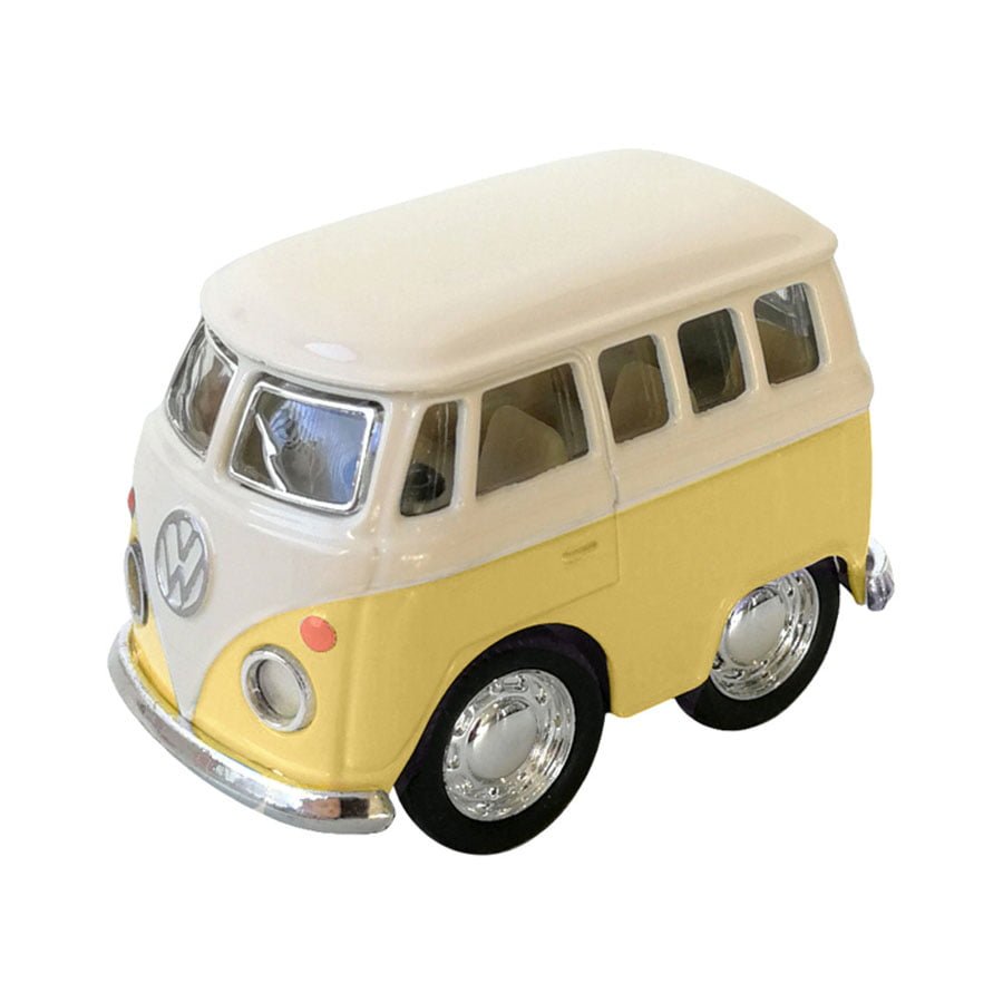 Esta Mini VW Combi, em Amarelo é uma réplica da famosa pão-de-forma que servirá tanto para brincar como para decorar a prateleira do quartinho.