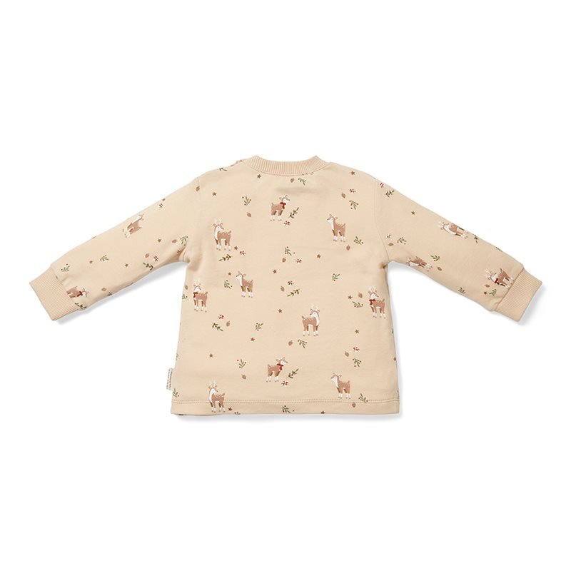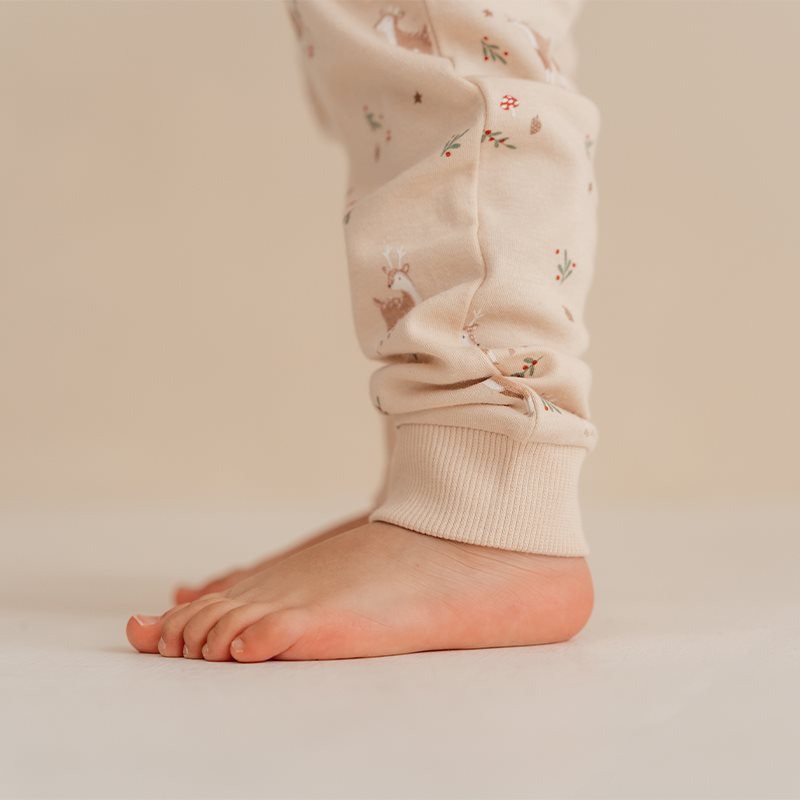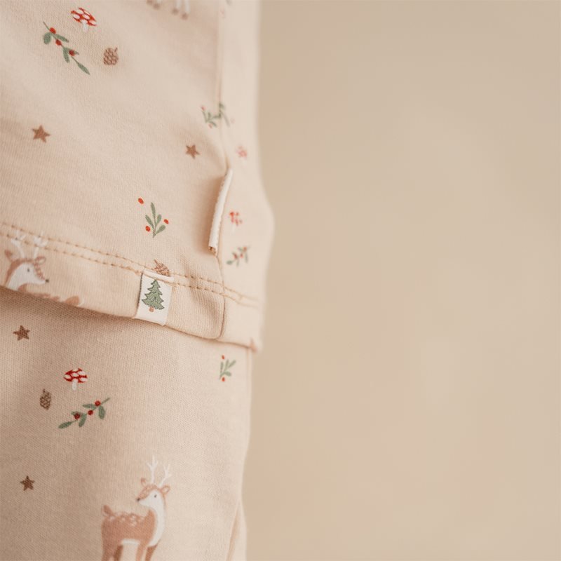 Boa noite pequenote. Que os teus sonhos sejam repletos de alegria natalina e renas! Este pijama confortável é perfeito para usar na véspera de Natal. É confortável, quentinho e super macio. É confeccionado em algodão orgânico certificado, tem base cor de areia decorada com renas em cenário de inverno. O conjunto de duas peças tem mangas compridas e pernas para maior conforto no inverno. Com o cós elástico e o fecho com botões de pressão, podes preparar facilmente o teu filho para a hora de dormir. Disponível em 50/56.