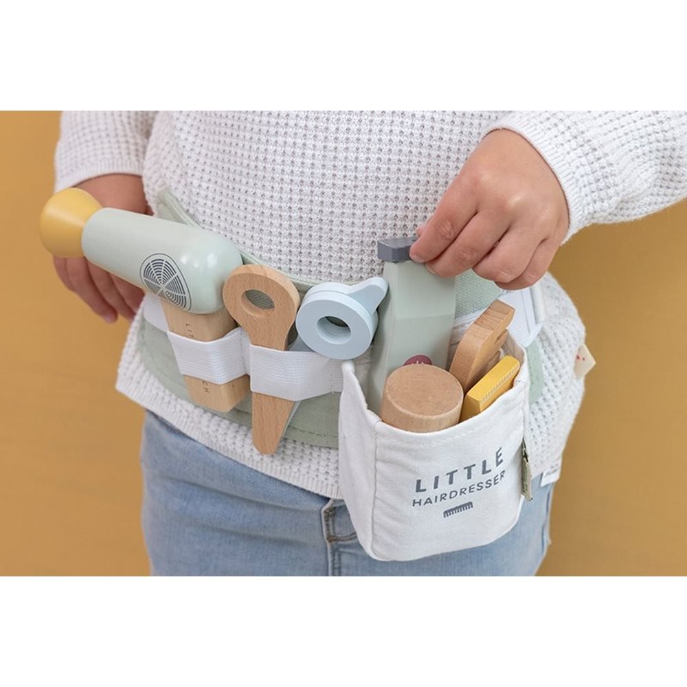 Torna-te num cabeleireiro profissional, no mundo do faz-de-conta, com a Little Dutch! Convida os amigos, familiares e bonecas para o teu super salão de cabeleireiro. Entra na personagem com o cinto ajustável e cria os penteados mais impressionantes de sempre. Este conjunto em madeira, é essencial para um cabeleireiro: inclui tesoura de brincar, secador de cabelo, máquina de alisar, máquina de cortar cabelo, pente, champoo, spray de cabelo e gel de modelagem. Os pequenos vão adorar este set de cabeleireiro para brincar. Sejam os meninos ou as meninas.