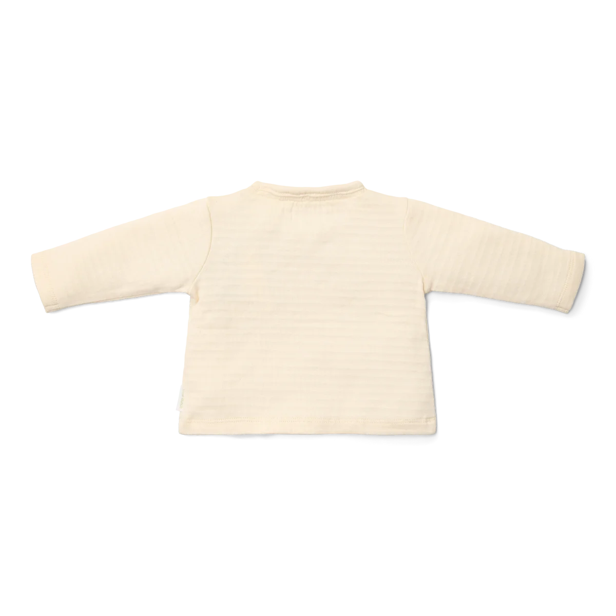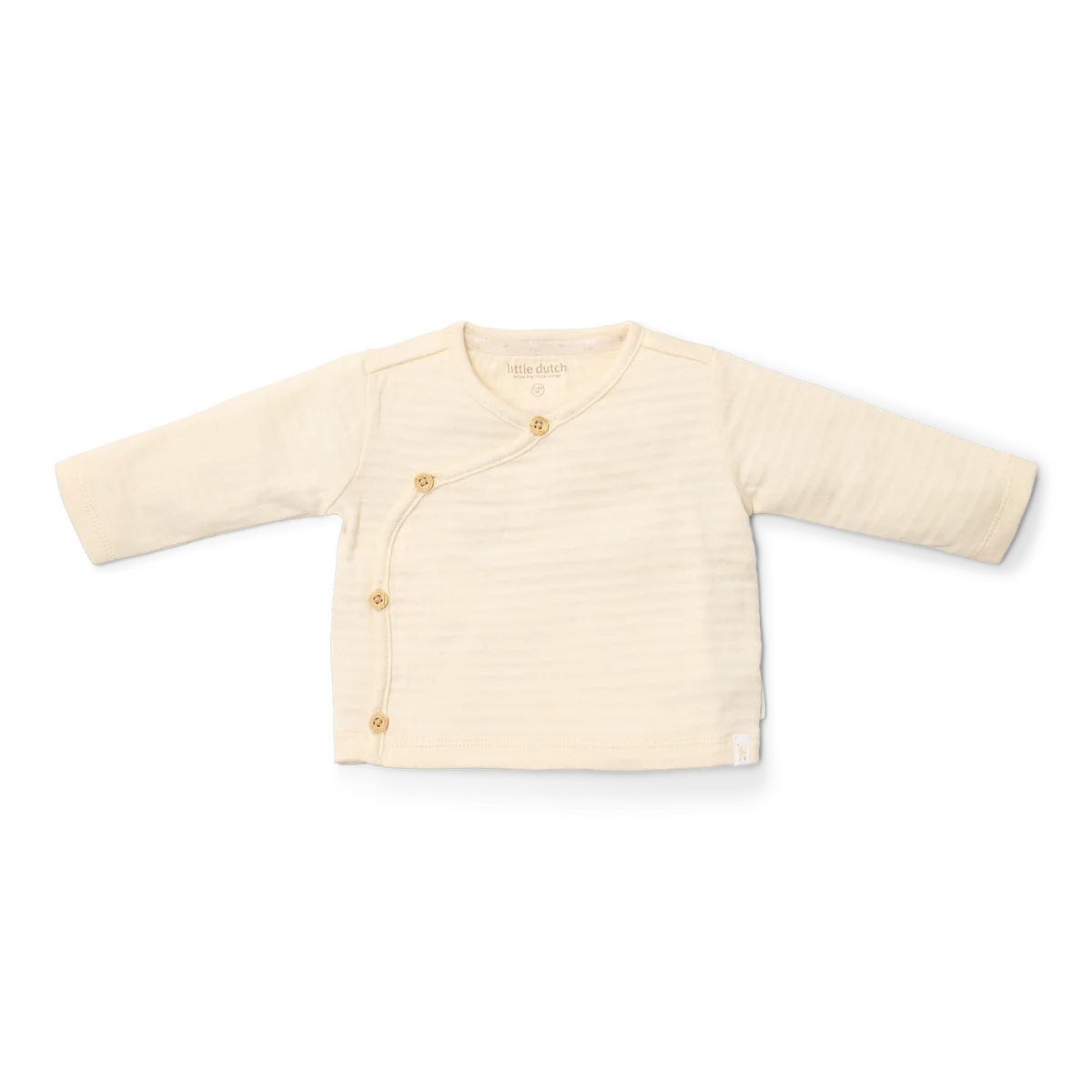 Conforto e estilo andam de mãos dadas! Esta camisola de manga comprida em tom creme com design sobreposto é feita de duas camadas finas de tecido macio, proporcionando uma sensação quente e um efeito subtil e elegante. Os botões com aspeto de madeira dão-lhe um toque encantador, enquanto o design cruzado facilita o vestir e despir. Confeccionada em algodão orgânico com certificação Oeko-Tex, é super suave para a pele do teu bebé. Disponível nos tamanhos 44 a 74.