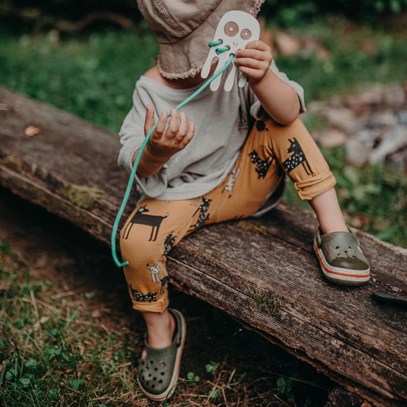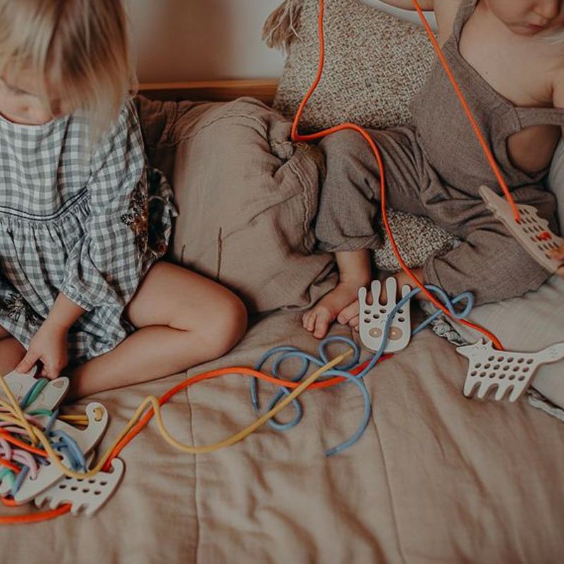 Entrelaçar os animais com um cordel passou agora a ser um momento alegre de diversão, ao ensinar as crianças sobre animais e cores, e um passatempo para elas, enquanto tentam passar o cordel pelos furos da tábua e criar padrões com eles.