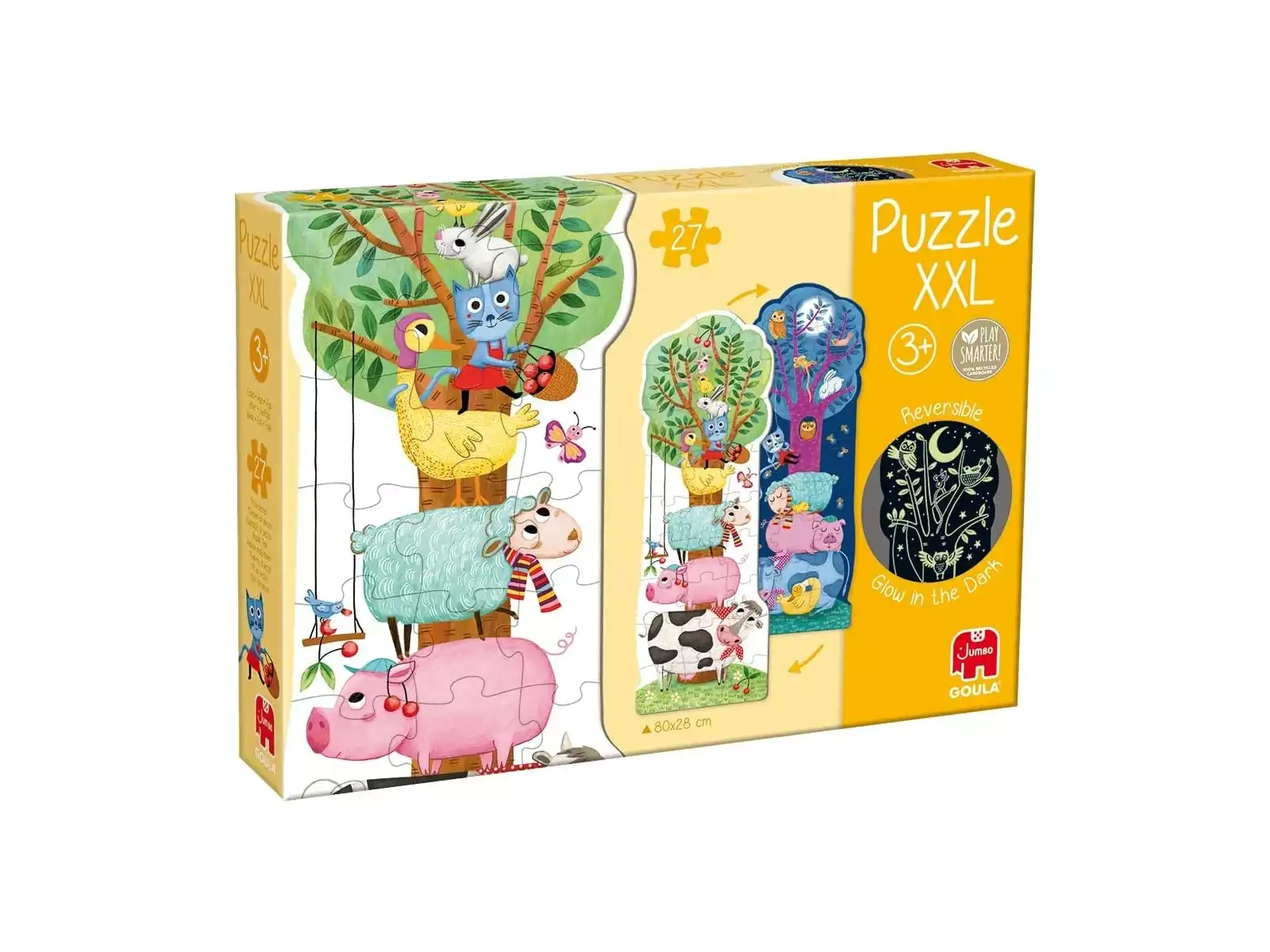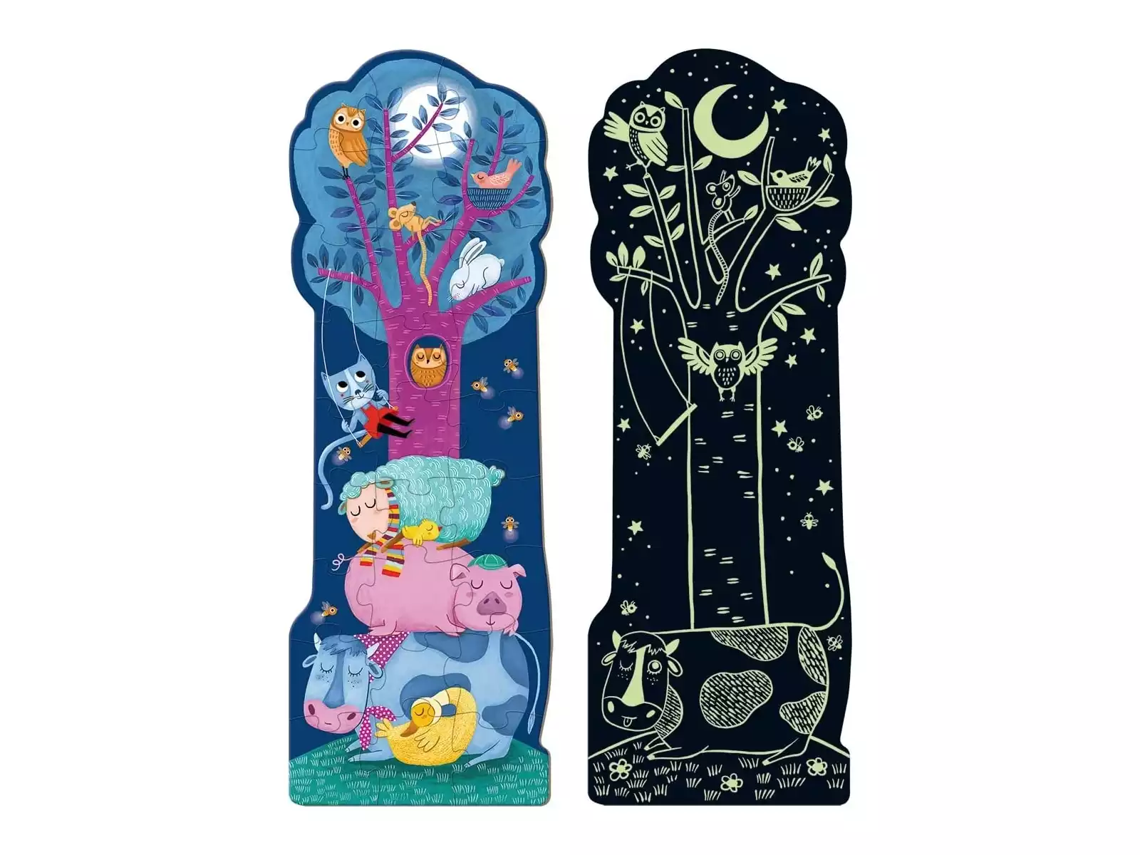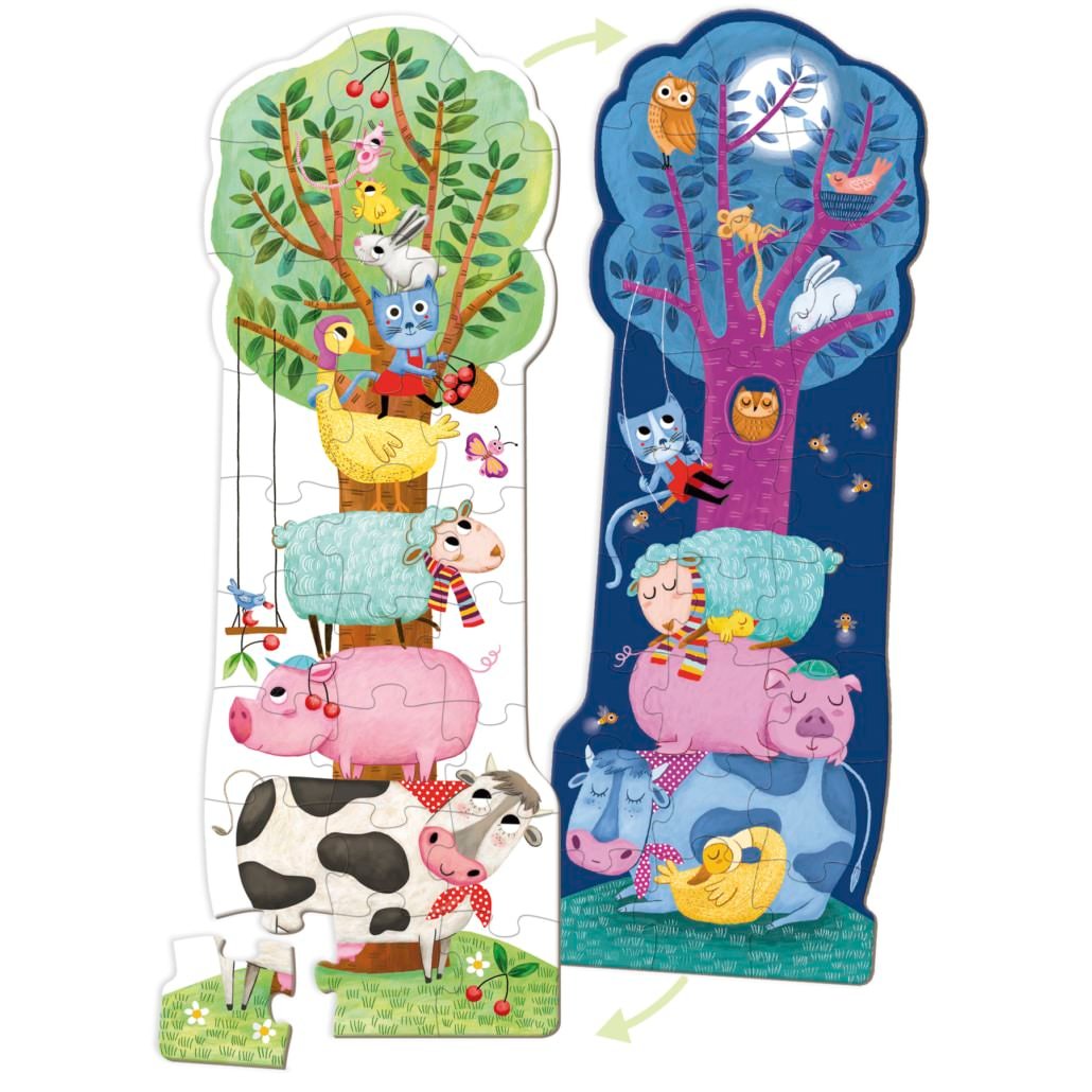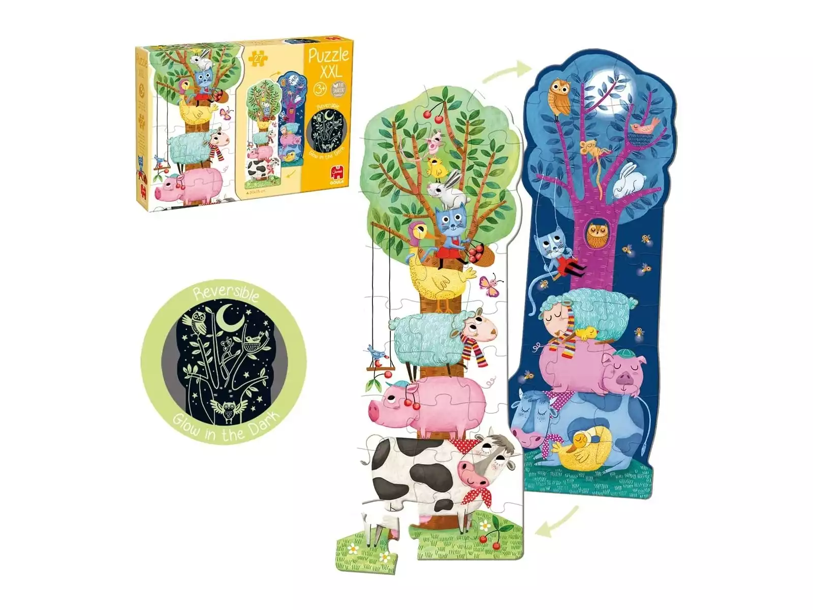 Explore a sua criatividade e imaginação! Juntamente com este Puzzle XXL Reversível Com Luz. Este puzzle de duas faces apresenta uma imagem fantástica dos animais mais famosos. No lado do dia, encontramos os animais mais famosos do campo a trepar a uma árvore, como a vaca, a ovelha, o porco, o coelho e muitos outros. No lado noturno, os animais dormem tranquilamente, enquanto a coruja se empoleira na árvore e os pirilampos voam. O puzzle de cena nocturna que brilha no escuro! Coloca a criação sobre uma fonte de luz para ativar o efeito de brilho.