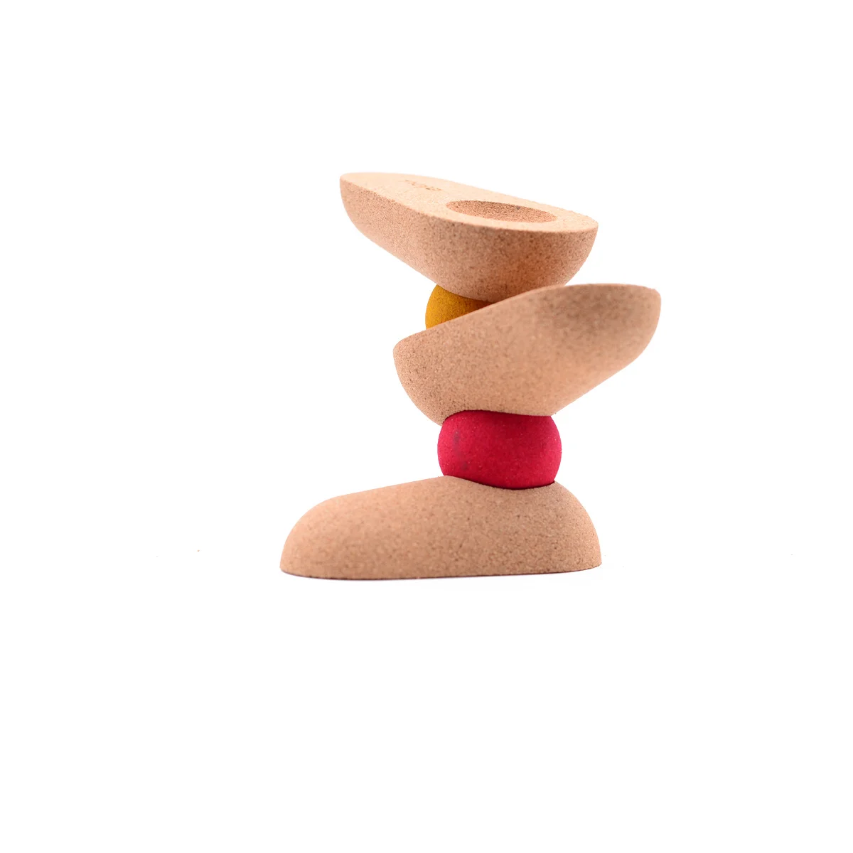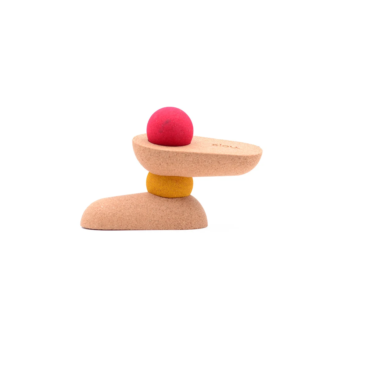 O Pebbles, da Elou Cork Toys, propõe uma tarefa aparentemente muito simples: Empilhar 5 peças coloridas.