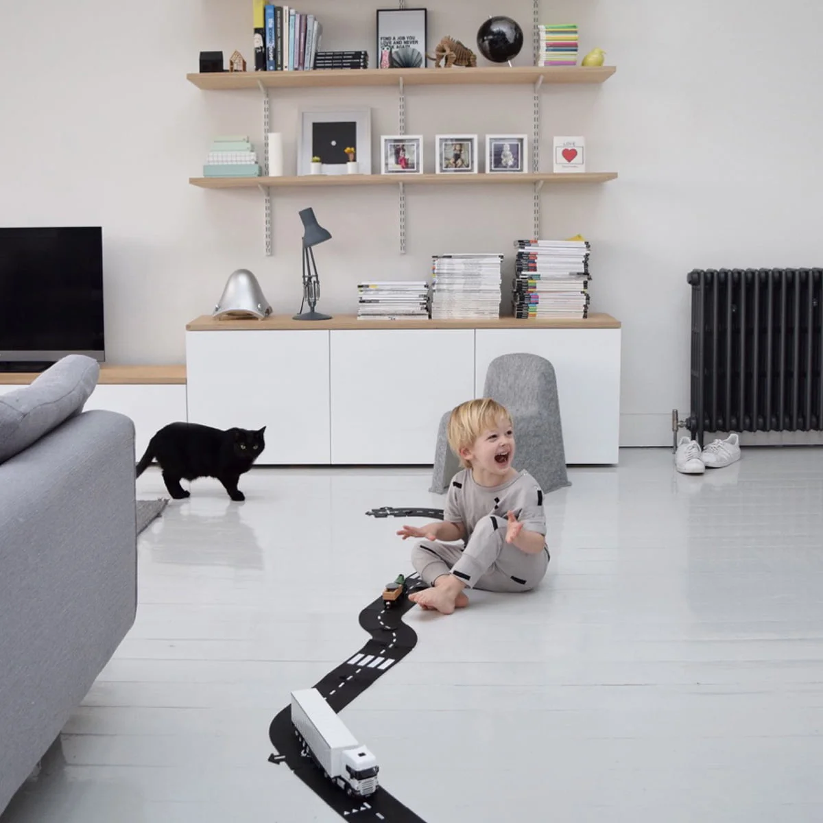 A Estrada é feita de uma borracha hiper flexível, para ser usada dentro e fora de casa, podendo ser aplicada em quase todas as superfícies. O melhor para os papás é que é super fácil de limpar e arrumar.